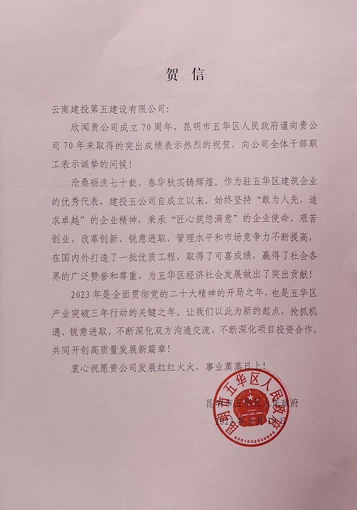 公司建司70周年之際,五華區(qū)人民政府送來(lái)賀信,向公司70年來(lái)取得的成績(jī)表示祝賀,向公司全體干部職工表示問(wèn)候。