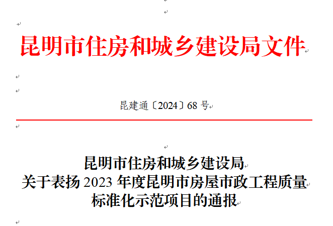技術(shù)支持: 方森科技近日,昆明市住房和城鄉(xiāng)建設(shè)局公布了《關(guān)于表揚2023年度昆明市房屋市政工程質(zhì)量標(biāo)準(zhǔn)化示范項目的通報》,公司多個項目獲獎。