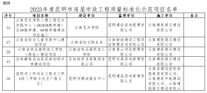 其中由公司承建的云南藝術(shù)學(xué)院二期工程藝術(shù)實踐中心(1#2#3#教學(xué)樓)及5#教學(xué)樓、6#教學(xué)樓建設(shè)項目施工、云南省婦女兒童發(fā)展中心建設(shè)項目、云南省林業(yè)高級技工學(xué)校(排危)建設(shè)項目、石林彝族自治縣民族初級中學(xué)建設(shè)項目、昆明市三環(huán)閉合工程東三環(huán)A段(羅衙立交至廣昌立交)等項目獲2023年度昆明市房屋市政標(biāo)準(zhǔn)化“示范項目”榮譽稱號。
