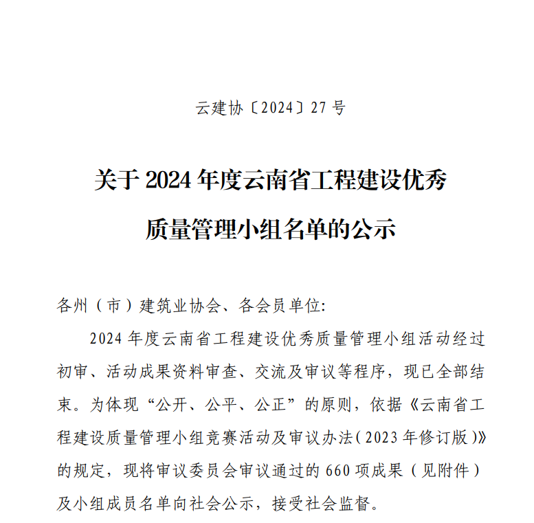 近日,昆明市建筑業(yè)協(xié)會、云南省建筑業(yè)協(xié)會及中國建筑業(yè)協(xié)會相繼頒發(fā)了2024年度工程建設(shè)質(zhì)量管理小組活動成果,公司憑借精細(xì)化的過程質(zhì)量管理和精益求精的品質(zhì)管理,榮獲2024年度中國建筑業(yè)協(xié)會工程建設(shè)質(zhì)量管理小組成果二等獎1項、云南省工程建設(shè)優(yōu)秀質(zhì)量管理小組成果11項、昆明市工程建設(shè)優(yōu)秀質(zhì)量管理小組成果4項,獲評昆明市建筑業(yè)協(xié)會“質(zhì)量管理優(yōu)秀企業(yè)”榮譽稱號。