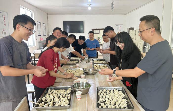 項目部職工們積極參與其中?;顒蝇F(xiàn)場,大家圍坐在長桌旁,桌上擺滿了包餃子所需的各式各樣的食材和工具。職工們忙碌而有序地包著餃子,每個人的臉上都洋溢著幸福的笑容。